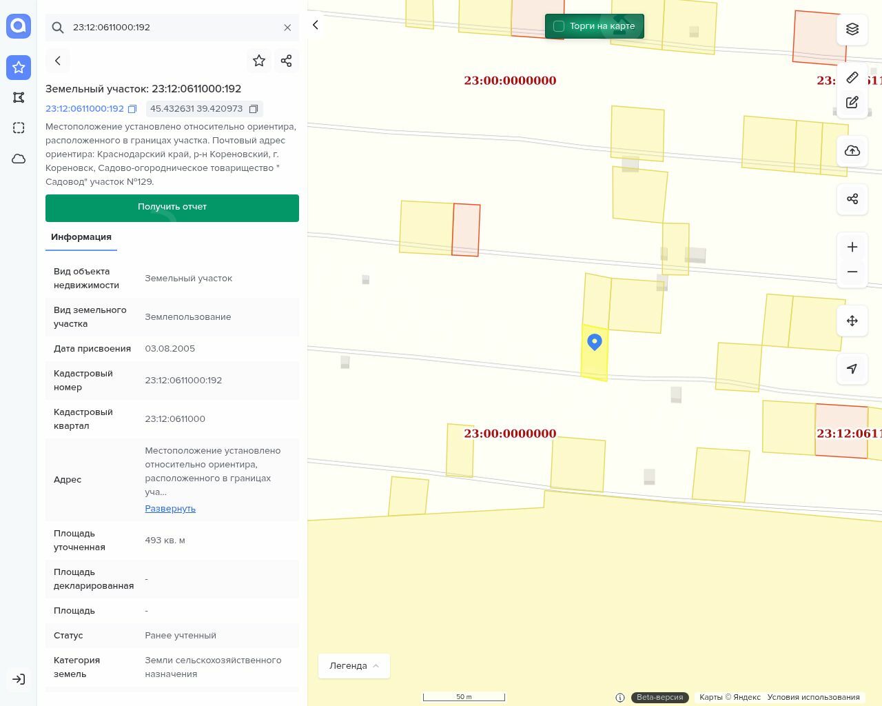 Земельный участок, площадь: 493 кв.м., категория земель: Земли сельскохозяйственного назначения, разрешенное использование: для садово-огороднических целей, кадастровый номер: 23:12:0611000:192