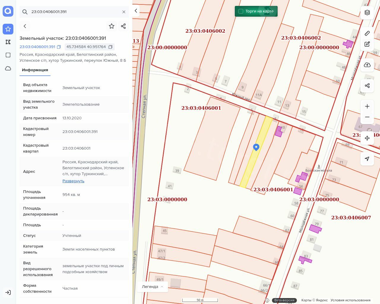 Лот №1. Земельный участок, общей площадью 954,0 кв. м., категория: земли населенных пунктов, вид разрешенного использования: Для ведения личного подсобного хозяйства, земельные участки под личным подсобным хозяйством, кадастровый номер: 23:03:0406001:391