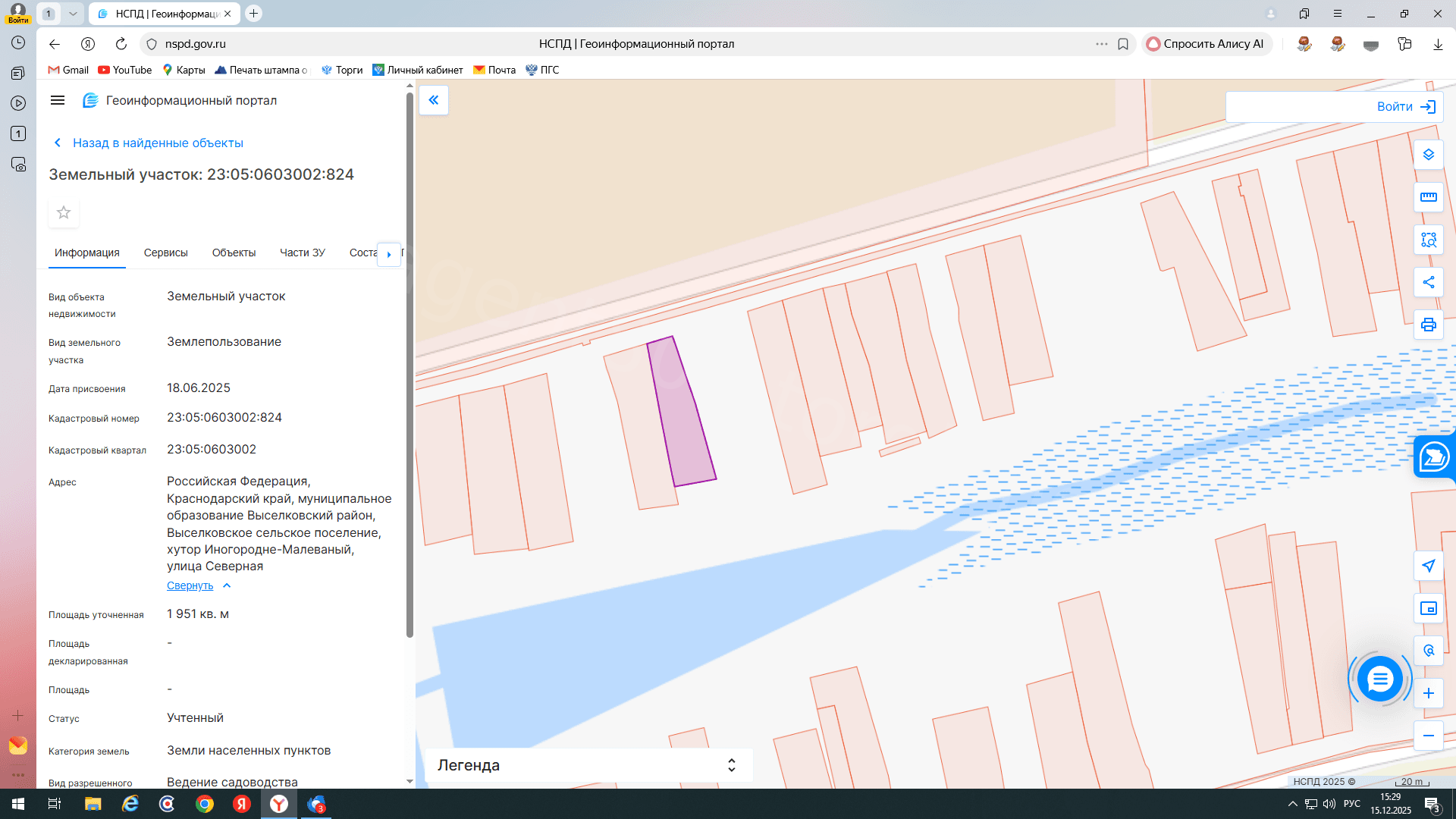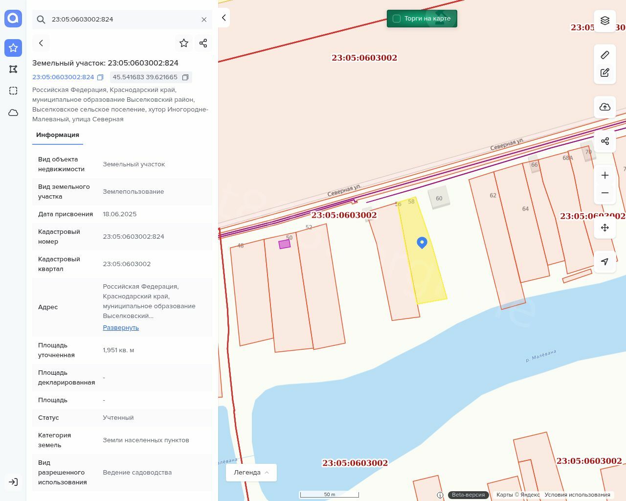 Вид разрешённого использования земельного участка: Ведение садоводства Кадастровый номер земельного участка: 23:05:0603002:824 Площадь земельного участка: 1951 м^2