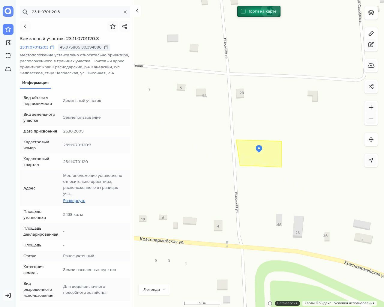 Земельный участок, площадь: 2 138 кв.м., категория земель: Земли населенных пунктов, разрешенное использование: Для ведения личного подсобного хозяйства, кадастровый номер: 23:11:0701120:3