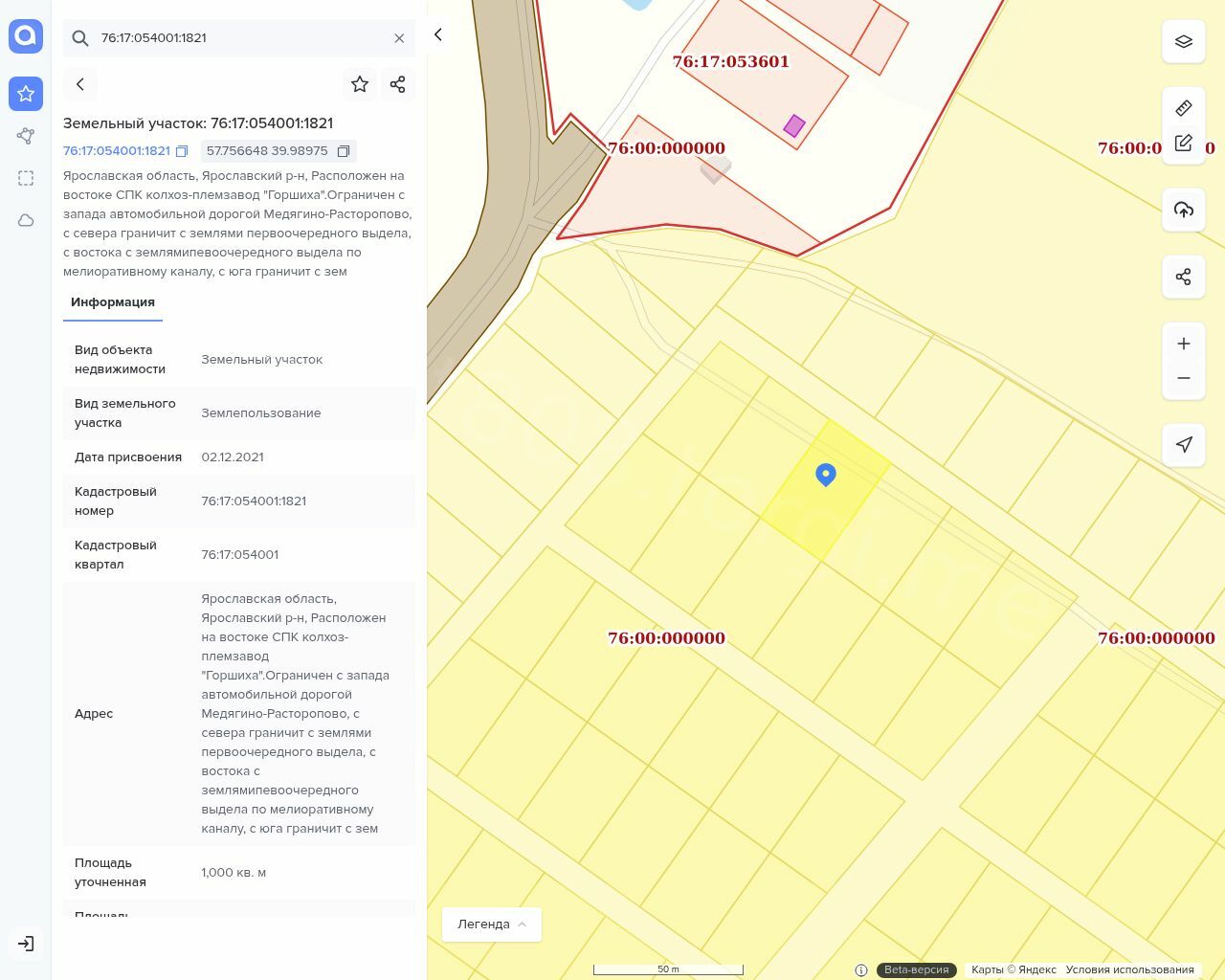 Земельный участок, кадастровый номер 76:17:054001:1821, площадь 1000 кв. м.