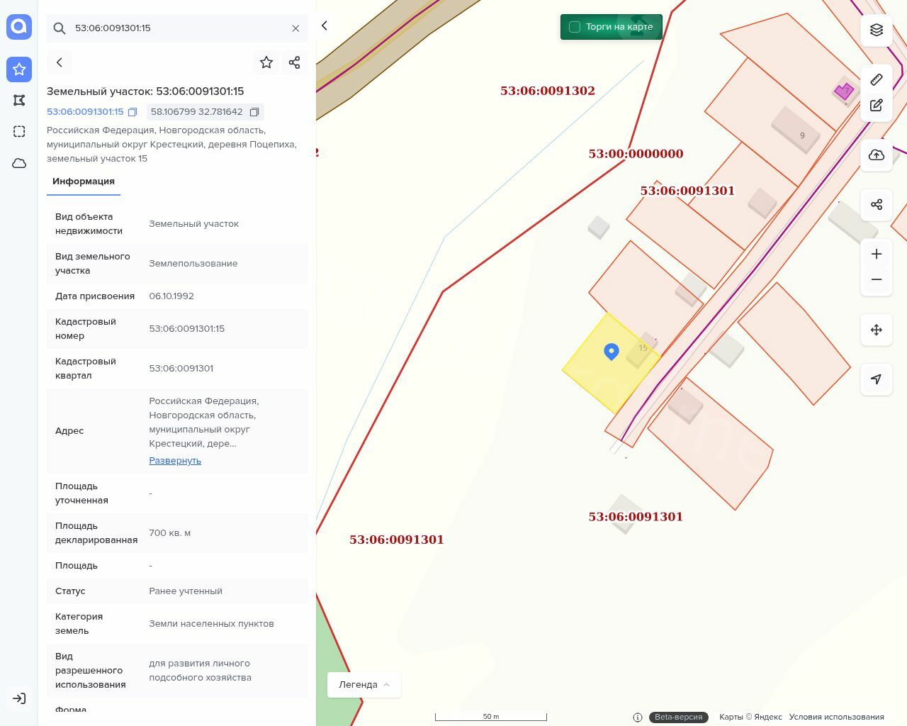 Земельный участок, кадастровый номер: 53:06:0091301:15, площадь: 700 кв.м., вид собственности: собственность. Все расходы на проведение кадастровых работ, направленных на установление, восстановление, уточнение и закрепление границ на местности земельного участка, его местоположения и площади, возлагаются на покупателя. Адрес: Новгородская область, р-н Крестецкий, с/п Новорахинское, д Поцепиха, д 15